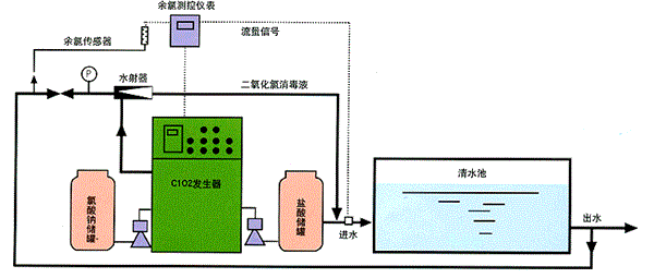 采用鹽酸與氯酸鈉定量注入到反應(yīng)釜內(nèi),反應(yīng)釜在加熱的情況下發(fā)生化學(xué)反應(yīng)生產(chǎn)二氧化氯與氯氣,再通過水射器吸入投加到消毒水體中。工藝采用負(fù)壓曝氣、正壓注入的技術(shù)來生產(chǎn)二氧化氯消毒液。